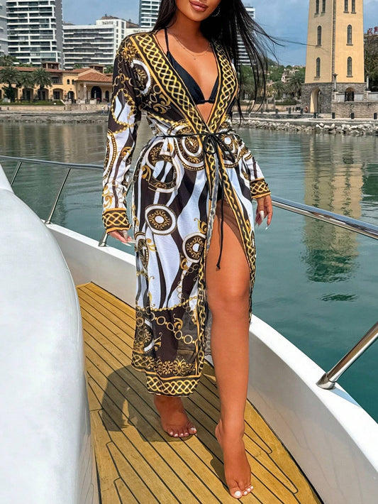 Women'S Holiday Chain Printed Long Sleeve Kimono Cover up (Random Print),Summer Beach